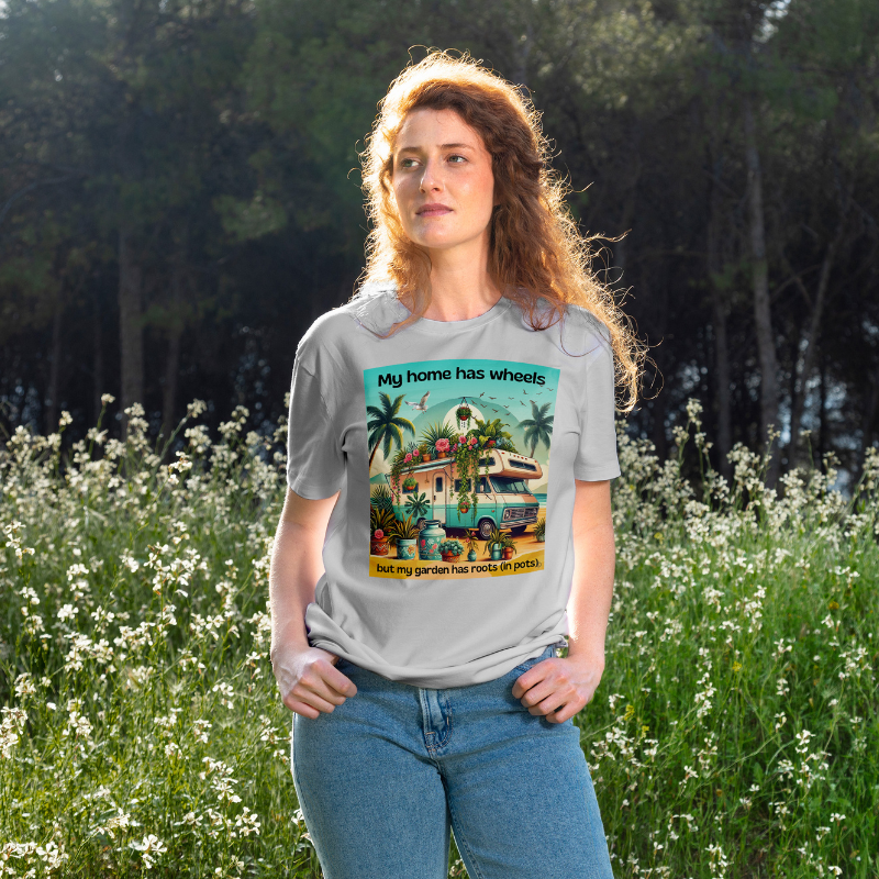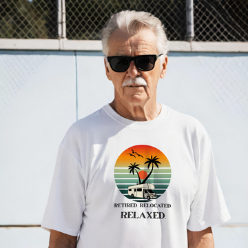 Man wearing a 'Rollin' Easy Co. Rooted in Comfort' t-shirt on a beach.